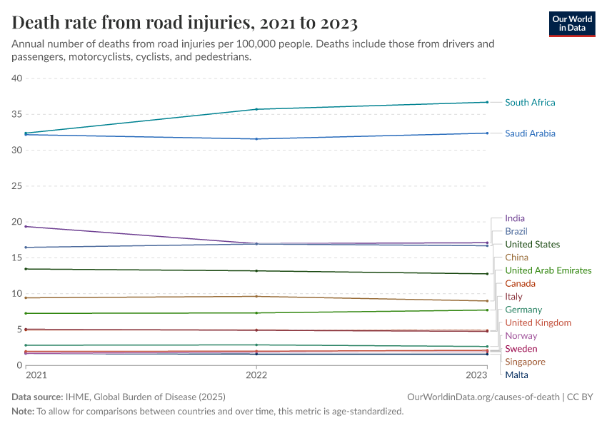 IHME, Global Burden of Disease (2025) – with major processing by Our World in Data. “Death rate from road injuries” [dataset]. IHME, Global Burden of Disease, “Global Burden of Disease - Deaths” [original data]. Retrieved February 23, 2026 from https://chart-preview-staging.owid.pages.dev:8789/20260211-173942/grapher/death-rates-road-incidents.html (archived on February 11, 2026).