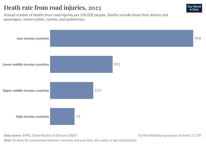 IHME, Global Burden of Disease (2025) – with major processing by Our World in Data. “Death rate from road injuries” [dataset]. IHME, Global Burden of Disease, “Global Burden of Disease - Deaths” [original data]. Retrieved February 23, 2026 from https://chart-preview-staging.owid.pages.dev:8789/20260211-173942/grapher/death-rates-road-incidents.html (archived on February 11, 2026).