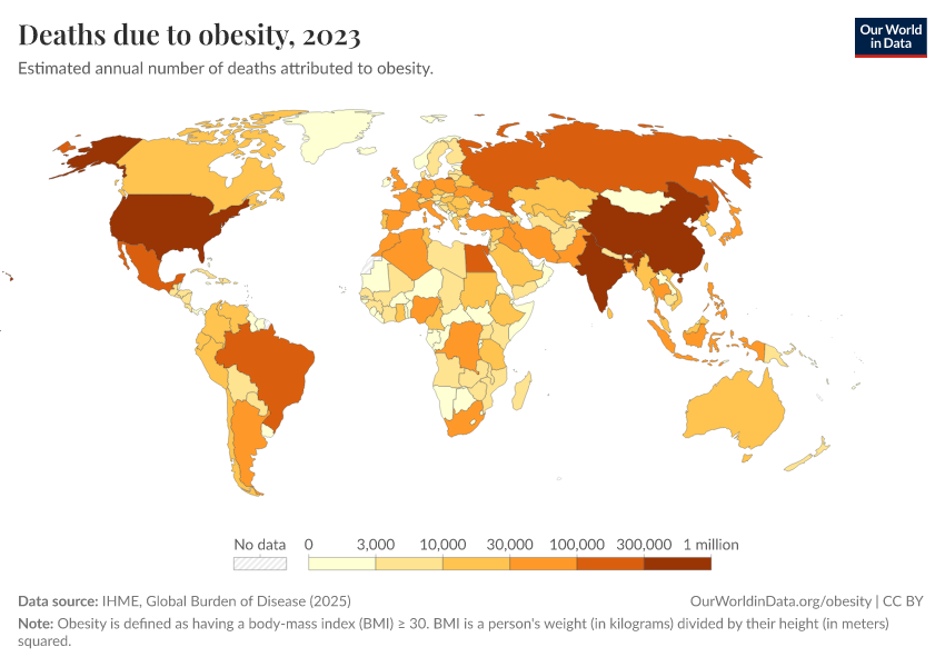 IHME, Global Burden of Disease (2025) – with major processing by Our World in Data. “Deaths due to obesity” [dataset]. IHME, Global Burden of Disease, “Global Burden of Disease - Risk Factors - Deaths” [original data]. Retrieved February 23, 2026 from https://chart-preview-staging.owid.pages.dev:8789/20260213-112438/grapher/deaths-due-to-obesity.html (archived on February 13, 2026).