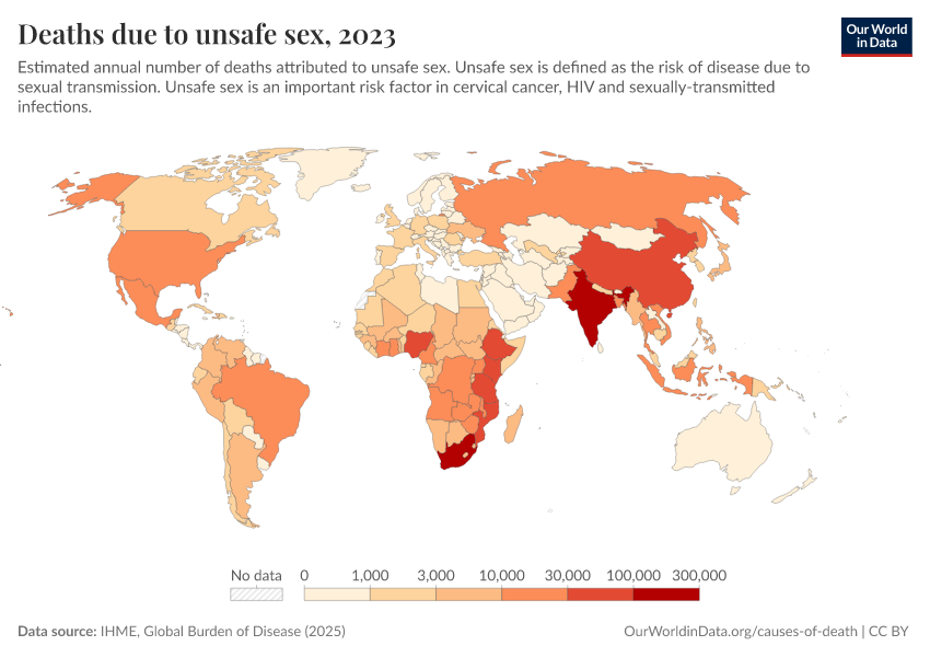 “Data Page: Deaths due to unsafe sex”, part of the following publication: Esteban Ortiz-Ospina and Max Roser (2016) - “Global Health”. Data adapted from IHME, Global Burden of Disease. Retrieved from https://chart-preview-staging.owid.pages.dev:8789/20260213-112438/grapher/deaths-due-to-unsafe-sex.html [online resource] (archived on February 13, 2026).How to cite this data