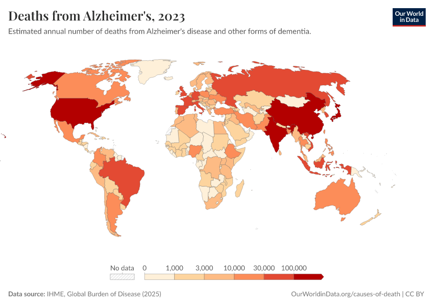 IHME, Global Burden of Disease (2025) – with major processing by Our World in Data. “Deaths from Alzheimer's” [dataset]. IHME, Global Burden of Disease, “Global Burden of Disease - Deaths” [original data]. Retrieved February 23, 2026 from https://chart-preview-staging.owid.pages.dev:8789/20260211-174736/grapher/deaths-from-alzheimers.html (archived on February 11, 2026).