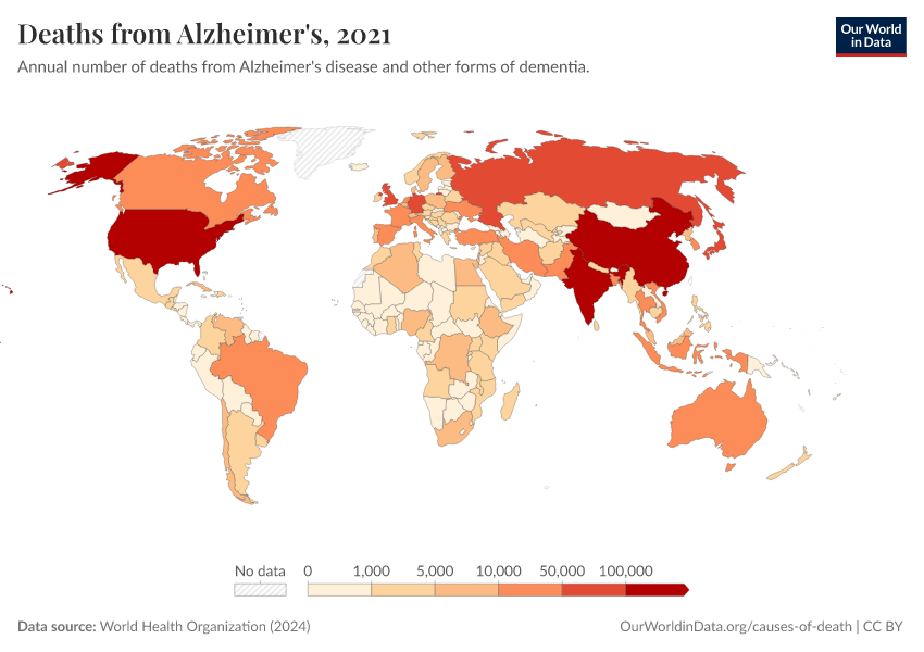 World Health Organization (2024) – with major processing by Our World in Data. “Deaths from Alzheimer's” [dataset]. World Health Organization, “Global Health Estimates” [original data]. Retrieved February 23, 2026 from https://chart-preview-staging.owid.pages.dev:8789/20250909-093708/grapher/deaths-from-alzheimers-other-dementias.html (archived on September 9, 2025).