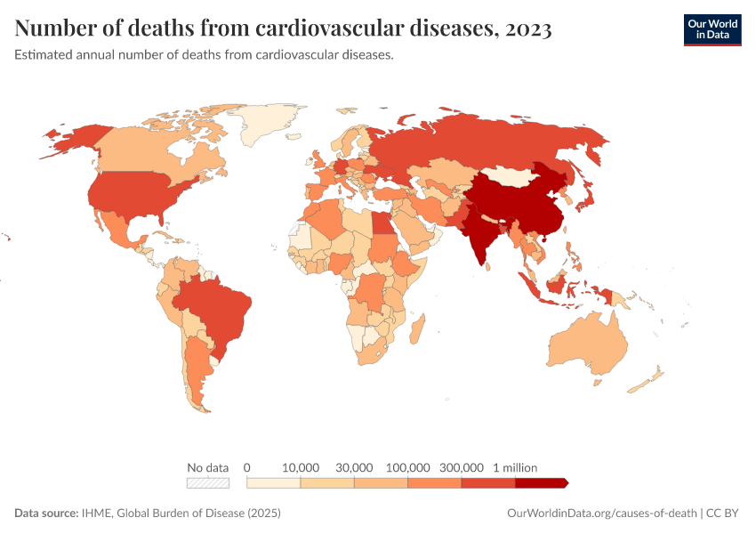 “Data Page: Number of deaths from cardiovascular diseases”, part of the following publication: Esteban Ortiz-Ospina and Max Roser (2016) - “Global Health”. Data adapted from IHME, Global Burden of Disease. Retrieved from https://chart-preview-staging.owid.pages.dev:8789/20260211-174736/grapher/deaths-from-cardiovascular-disease.html [online resource] (archived on February 11, 2026).How to cite this data