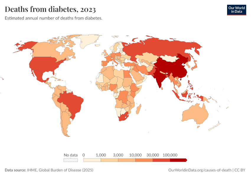 IHME, Global Burden of Disease (2025) – with major processing by Our World in Data. “Deaths from diabetes” [dataset]. IHME, Global Burden of Disease, “Global Burden of Disease - Deaths” [original data]. Retrieved February 23, 2026 from https://chart-preview-staging.owid.pages.dev:8789/20260211-174736/grapher/deaths-from-diabetes.html (archived on February 11, 2026).