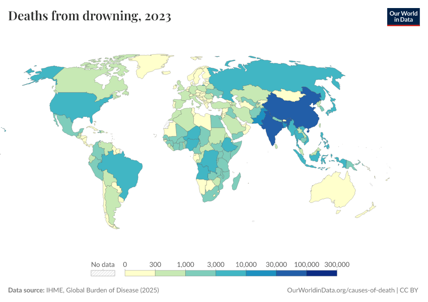 IHME, Global Burden of Disease (2025) – with major processing by Our World in Data. “Deaths from drowning” [dataset]. IHME, Global Burden of Disease, “Global Burden of Disease - Deaths” [original data]. Retrieved February 23, 2026 from https://chart-preview-staging.owid.pages.dev:8789/20260211-174736/grapher/deaths-from-drowning.html (archived on February 11, 2026).