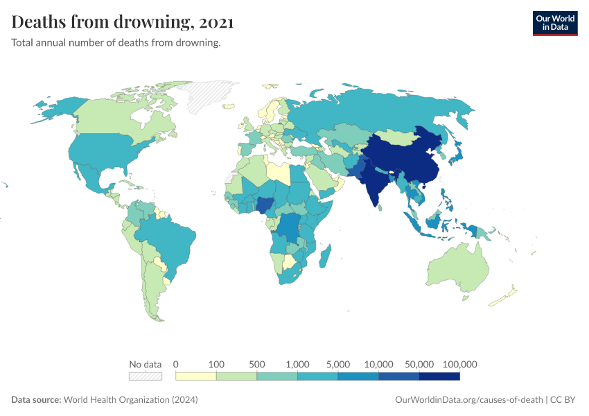 World Health Organization (2024) – with major processing by Our World in Data. “Deaths from drowning” [dataset]. World Health Organization, “Global Health Estimates” [original data]. Retrieved February 23, 2026 from https://chart-preview-staging.owid.pages.dev:8789/20250909-093708/grapher/deaths-from-drowning-ghe.html (archived on September 9, 2025).