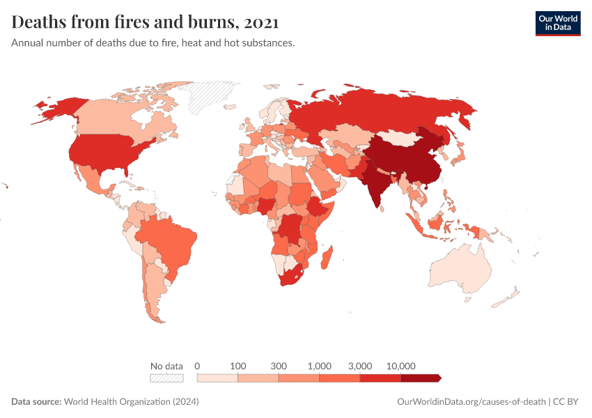 “Data Page: Deaths from fires and burns”, part of the following publication: Esteban Ortiz-Ospina and Max Roser (2016) - “Global Health”. Data adapted from World Health Organization. Retrieved from https://chart-preview-staging.owid.pages.dev:8789/20250909-093708/grapher/deaths-from-fires-and-burns-who.html [online resource] (archived on September 9, 2025).How to cite this data