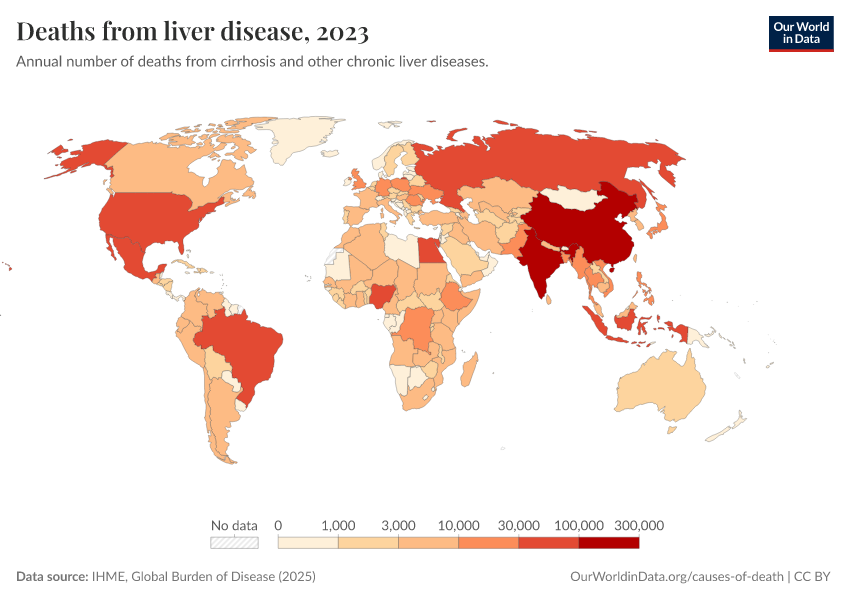 IHME, Global Burden of Disease (2025) – with major processing by Our World in Data. “Deaths from liver disease” [dataset]. IHME, Global Burden of Disease, “Global Burden of Disease - Deaths” [original data]. Retrieved February 23, 2026 from https://chart-preview-staging.owid.pages.dev:8789/20260211-174736/grapher/deaths-from-liver-disease.html (archived on February 11, 2026).
