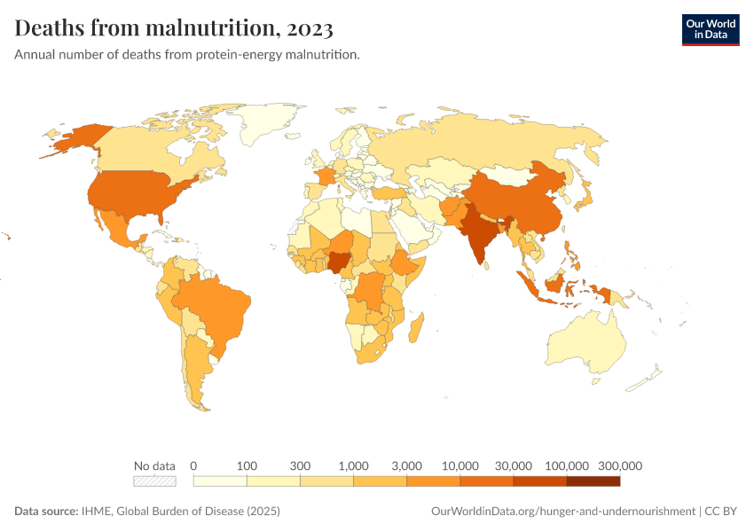 IHME, Global Burden of Disease (2025) – with major processing by Our World in Data. “Deaths from malnutrition” [dataset]. IHME, Global Burden of Disease, “Global Burden of Disease - Deaths” [original data]. Retrieved February 23, 2026 from https://chart-preview-staging.owid.pages.dev:8789/20260211-174736/grapher/deaths-from-malnutrition.html (archived on February 11, 2026).