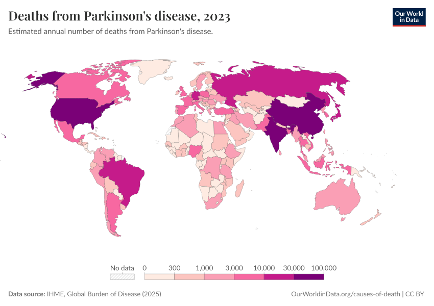 IHME, Global Burden of Disease (2025) – with major processing by Our World in Data. “Deaths from Parkinson's disease” [dataset]. IHME, Global Burden of Disease, “Global Burden of Disease - Deaths” [original data]. Retrieved February 23, 2026 from https://chart-preview-staging.owid.pages.dev:8789/20260211-174736/grapher/deaths-from-parkinsons-disease.html (archived on February 11, 2026).