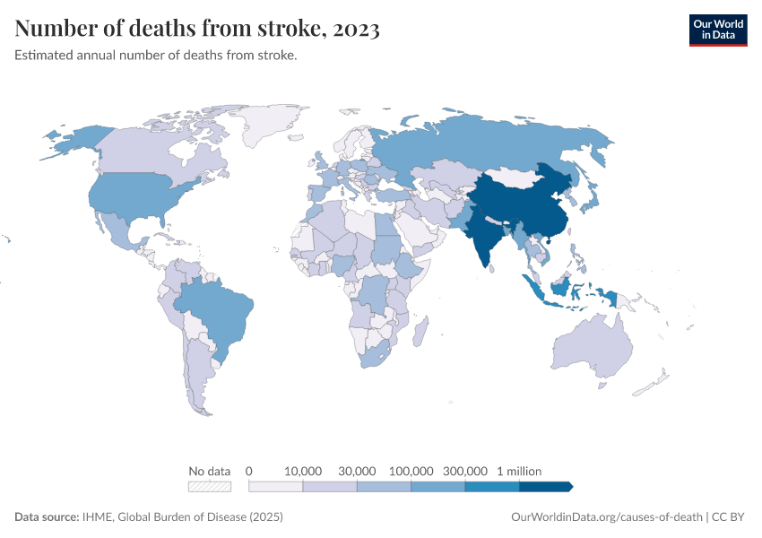 IHME, Global Burden of Disease (2025) – with major processing by Our World in Data. “Number of deaths from stroke” [dataset]. IHME, Global Burden of Disease, “Global Burden of Disease - Deaths” [original data]. Retrieved February 23, 2026 from https://chart-preview-staging.owid.pages.dev:8789/20260211-174736/grapher/deaths-from-strokes.html (archived on February 11, 2026).