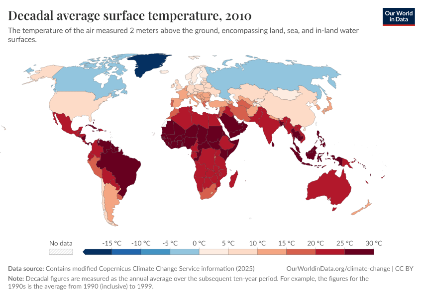 “Data Page: Decadal average surface temperature”, part of the following publication: Hannah Ritchie, Pablo Rosado, and Veronika Samborska (2024) - “Climate Change”. Data adapted from Contains modified Copernicus Climate Change Service information. Retrieved from https://chart-preview-staging.owid.pages.dev:8789/20260210-110915/grapher/decadal-average-surface-temperature.html [online resource] (archived on February 10, 2026).How to cite this data