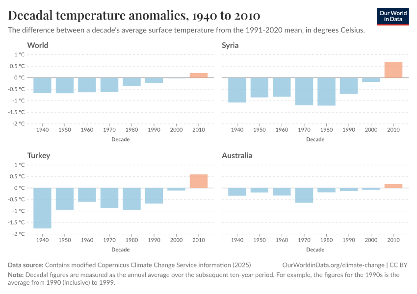 Contains modified Copernicus Climate Change Service information (2025) – with major processing by Our World in Data. “Decadal temperature anomalies” [dataset]. Contains modified Copernicus Climate Change Service information, “ERA5 monthly averaged data on single levels from 1940 to present 2” [original data]. Retrieved February 23, 2026 from https://chart-preview-staging.owid.pages.dev:8789/20260210-110915/grapher/decadal-temperature-anomaly.html (archived on February 10, 2026).