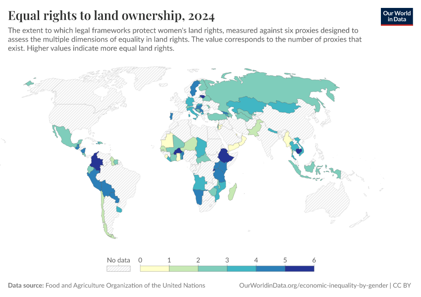 Food and Agriculture Organization of the United Nations – processed by Our World in Data. “Equal rights to land ownership” [dataset]. Food and Agriculture Organization of the United Nations, “Data from multiple sources” [original data]. Retrieved February 23, 2026 from https://chart-preview-staging.owid.pages.dev:8789/20251120-211749/grapher/degree-to-which-the-legal-framework-guarantees-womens-equal-rights-to-land-ownership-andor-control.html (archived on November 20, 2025).