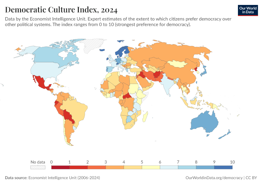 Economist Intelligence Unit (2006-2024) – processed by Our World in Data. “Democratic Culture Index” [dataset]. Economist Intelligence Unit, “Democracy Index 2021: The China challenge”; Economist Intelligence Unit, “Democracy Index 2022: Frontline democracy and the battle for Ukraine”; Economist Intelligence Unit, “Democracy Index 2023: Age of Conflict”; Economist Intelligence Unit, “Democracy Index 2024: What's wrong with representative democracy?”; Gapminder, “Democracy Index v4”; Various sources, “Population” [original data]. Retrieved February 23, 2026 from https://chart-preview-staging.owid.pages.dev:8789/20260119-070102/grapher/democratic-culture-index-eiu.html (archived on January 19, 2026).