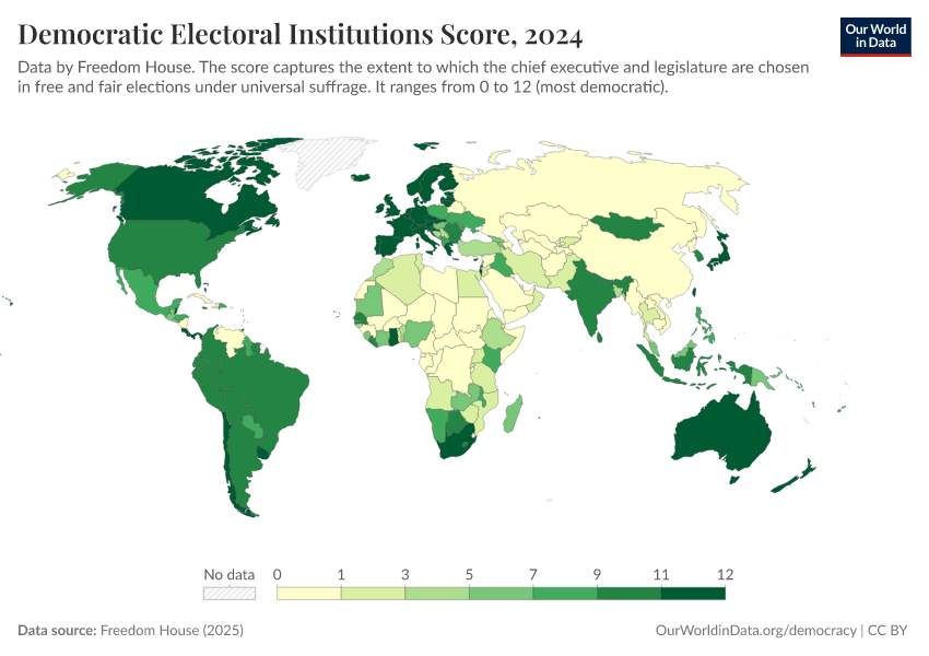 Freedom House (2025) – processed by Our World in Data. “Democratic Electoral Institutions Score” [dataset]. Freedom House, “Freedom in the World” [original data]. Retrieved February 23, 2026 from https://chart-preview-staging.owid.pages.dev:8789/20260204-170225/grapher/democratic-electoral-institutions-fh.html (archived on February 4, 2026).