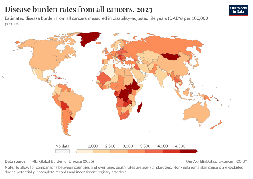IHME, Global Burden of Disease (2025) – with major processing by Our World in Data. “Disease burden rates from all cancers” [dataset]. IHME, Global Burden of Disease, “Global Burden of Disease - DALYs” [original data]. Retrieved February 23, 2026 from https://chart-preview-staging.owid.pages.dev:8789/20260211-174736/grapher/disease-burden-rates-from-cancers.html (archived on February 11, 2026).