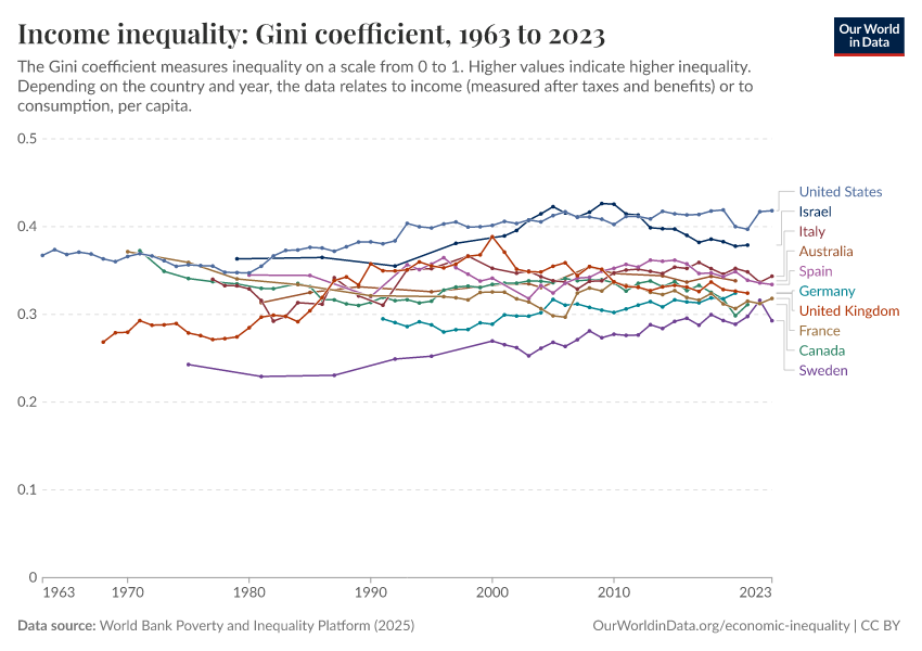 World Bank Poverty and Inequality Platform (2025) – with major processing by Our World in Data. “Income inequality: Gini coefficient – World Bank” [dataset]. World Bank Poverty and Inequality Platform, “World Bank Poverty and Inequality Platform (PIP) 20250930_2021, 20250930_2017” [original data]. Retrieved February 23, 2026 from https://chart-preview-staging.owid.pages.dev:8789/20260127-114142/grapher/economic-inequality-gini-index.html (archived on January 27, 2026).