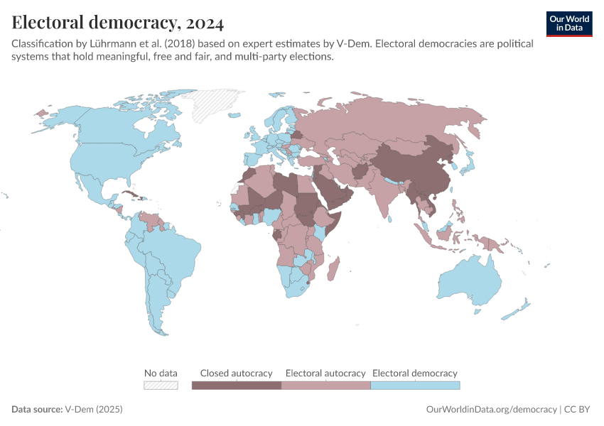 V-Dem (2025) – processed by Our World in Data. “Political regime – reduced” [dataset]. V-Dem, “Democracy report v15” [original data]. Retrieved February 23, 2026 from https://chart-preview-staging.owid.pages.dev:8789/20260119-070102/grapher/electoral-democracy-row.html (archived on January 19, 2026).