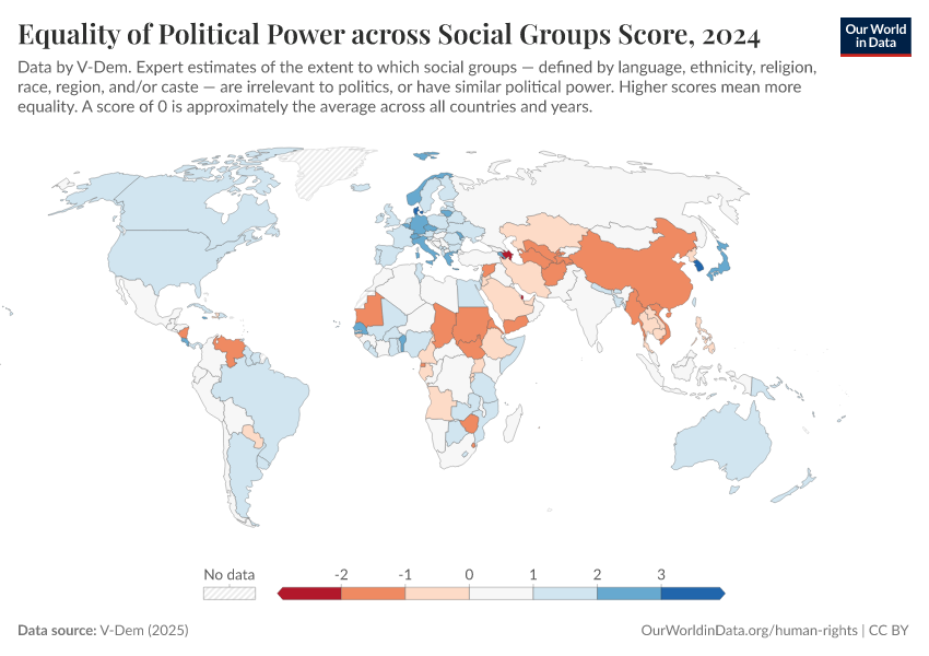 “Data Page: Equality of political power across social groups”, part of the following publication: Bastian Herre, Lucas Rodés-Guirao, and Esteban Ortiz-Ospina (2013) - “Democracy”. Data adapted from V-Dem. Retrieved from https://chart-preview-staging.owid.pages.dev:8789/20260204-170225/grapher/equality-of-political-power-across-social-groups-score.html [online resource] (archived on February 4, 2026).How to cite this data