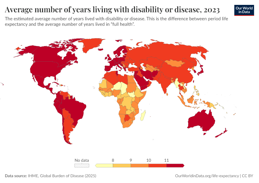 “Data Page: Average number of years living with disability or disease”, part of the following publication: Saloni Dattani, Lucas Rodés-Guirao, Hannah Ritchie, Esteban Ortiz-Ospina, and Max Roser (2023) - “Life Expectancy”. Data adapted from IHME, Global Burden of Disease. Retrieved from https://chart-preview-staging.owid.pages.dev:8789/20260213-171235/grapher/expected-years-of-living-with-disability-or-disease-burden.html [online resource] (archived on February 13, 2026).How to cite this data