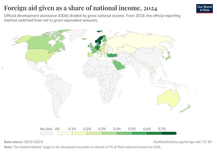 “Data Page: Foreign aid given as a share of national income”, part of the following publication: Bastian Herre, Pablo Arriagada, Simon van Teutem, and Hannah Ritchie (2024) - “Foreign Aid”. Data adapted from OECD. Retrieved from https://chart-preview-staging.owid.pages.dev:8789/20251230-141326/grapher/foreign-aid-given-as-a-share-of-national-income.html [online resource] (archived on December 30, 2025).