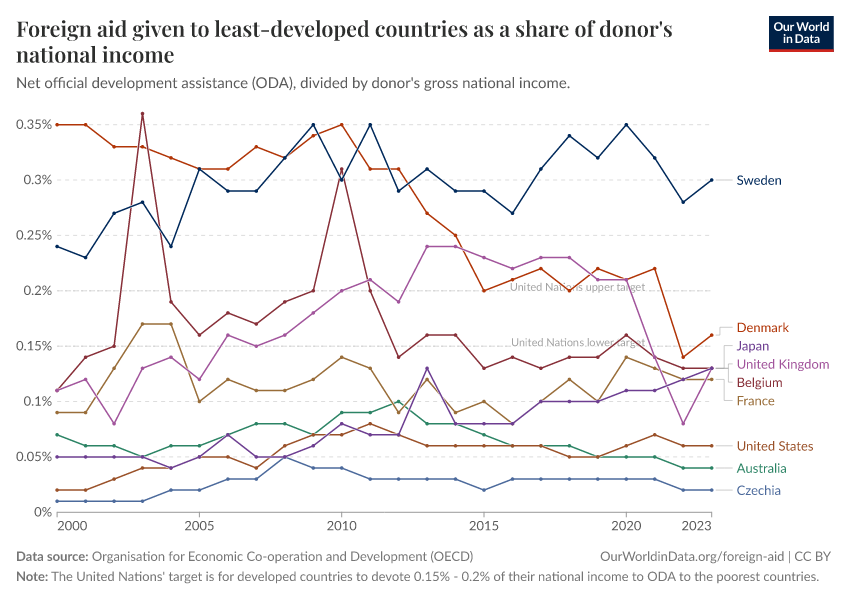 “Data Page: Foreign aid given to least-developed countries as a share of donor's national income”. Our World in Data (2026). Data adapted from Organisation for Economic Co-operation and Development. Retrieved from https://chart-preview-staging.owid.pages.dev:8789/20251120-211038/grapher/foreign-aid-given-to-least-developed-countries-as-a-share-of-donors-national-income.html [online resource] (archived on November 20, 2025).How to cite this data