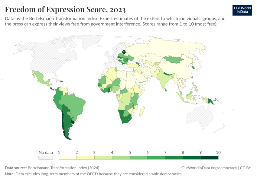 Bertelsmann Transformation Index (2024) – processed by Our World in Data. “Freedom of Expression Score” [dataset]. Bertelsmann Transformation Index, “Bertelsmann Transformation Index, Scores” [original data]. Retrieved February 23, 2026 from https://chart-preview-staging.owid.pages.dev:8789/20260204-165456/grapher/freedom-of-expression-score-bti.html (archived on February 4, 2026).