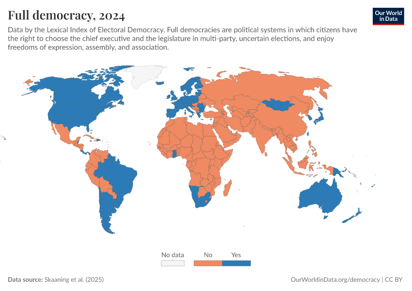 “Data Page: Full democracy”, part of the following publication: Bastian Herre, Lucas Rodés-Guirao, and Esteban Ortiz-Ospina (2013) - “Democracy”. Data adapted from Skaaning et al.. Retrieved from https://chart-preview-staging.owid.pages.dev:8789/20260119-065148/grapher/full-democracy-lexical.html [online resource] (archived on January 19, 2026).How to cite this data