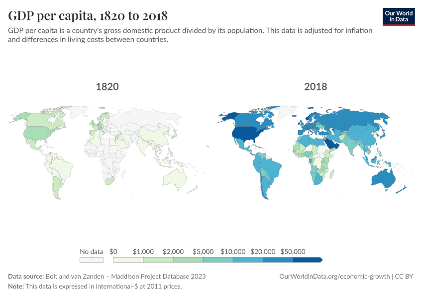 “Data Page: GDP per capita”, part of the following publication: Max Roser, Bertha Rohenkohl, Pablo Arriagada, Joe Hasell, Hannah Ritchie, and Esteban Ortiz-Ospina (2023) - “Economic Growth”. Data adapted from Bolt and van Zanden. Retrieved from https://chart-preview-staging.owid.pages.dev:8789/20251111-144738/grapher/gdp-per-capita-maddison-project-database.html [online resource] (archived on November 11, 2025).