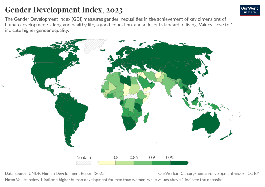“Data Page: Gender Development Index”. Our World in Data (2026). Data adapted from UNDP, Human Development Report. Retrieved from https://chart-preview-staging.owid.pages.dev:8789/20260119-065148/grapher/gender-development-index.html [online resource] (archived on January 19, 2026).How to cite this data
