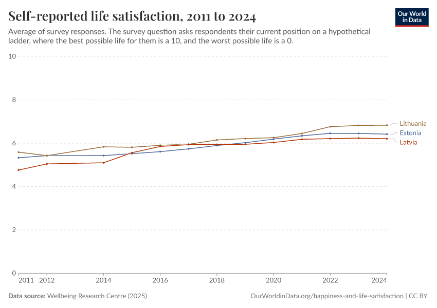 Wellbeing Research Centre (2025) – with major processing by Our World in Data. “Self-reported life satisfaction” [dataset]. Wellbeing Research Centre, “World Happiness Report 2025” [original data]. Retrieved February 23, 2026 from https://chart-preview-staging.owid.pages.dev:8789/20260119-065148/grapher/happiness-cantril-ladder.html (archived on January 19, 2026).
