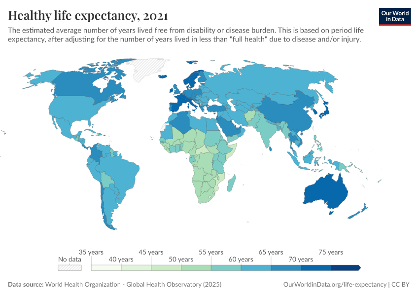 “Data Page: Healthy life expectancy”. Our World in Data (2026). Data adapted from World Health Organization. Retrieved from https://chart-preview-staging.owid.pages.dev:8789/20260119-070102/grapher/healthy-life-expectancy-at-birth.html [online resource] (archived on January 19, 2026).How to cite this data
