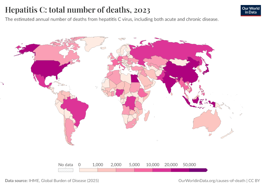 IHME, Global Burden of Disease (2025) – with major processing by Our World in Data. “Hepatitis C: total number of deaths” [dataset]. IHME, Global Burden of Disease, “Global Burden of Disease - Deaths” [original data]. Retrieved February 23, 2026 from https://chart-preview-staging.owid.pages.dev:8789/20260211-174736/grapher/hepatitis-c-number-of-deaths.html (archived on February 11, 2026).
