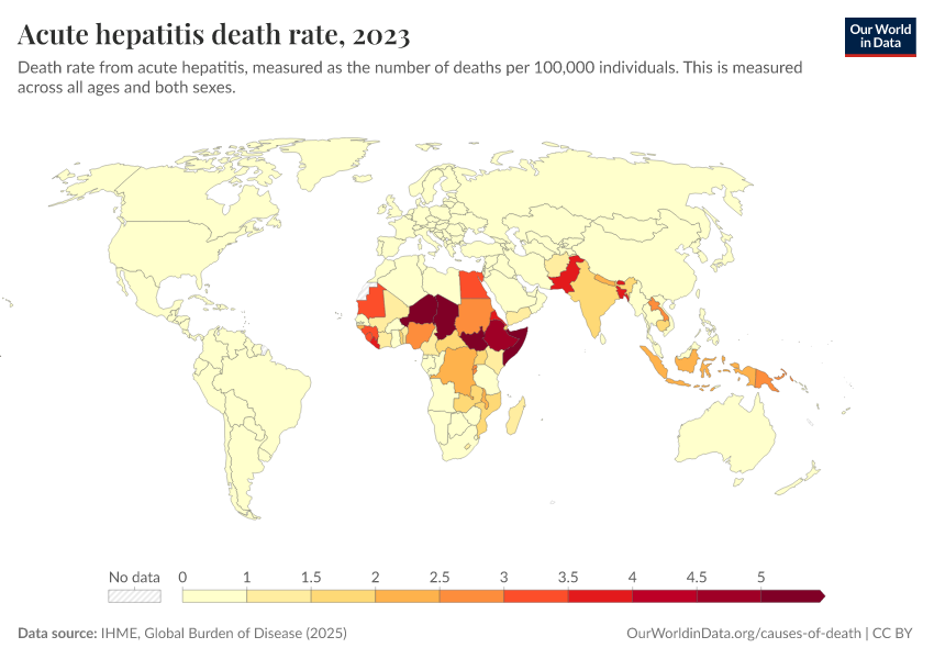IHME, Global Burden of Disease (2025) – with major processing by Our World in Data. “Acute hepatitis death rate” [dataset]. IHME, Global Burden of Disease, “Global Burden of Disease - Deaths” [original data]. Retrieved February 23, 2026 from https://chart-preview-staging.owid.pages.dev:8789/20260211-174736/grapher/hepatitis-death-rate.html (archived on February 11, 2026).
