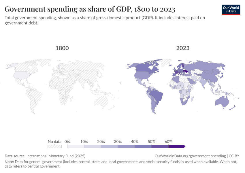 International Monetary Fund (2025) – with minor processing by Our World in Data. “Government spending as share of GDP” [dataset]. International Monetary Fund, “Public Finances in Modern History” [original data]. Retrieved February 23, 2026 from https://chart-preview-staging.owid.pages.dev:8789/20250909-093708/grapher/historical-gov-spending-gdp.html (archived on September 9, 2025).