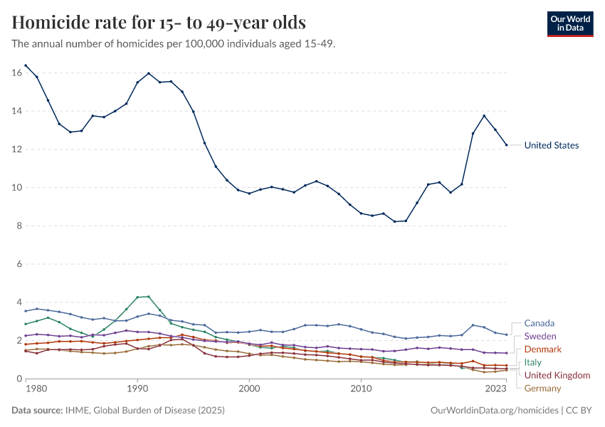 “Data Page: Homicide rate for 15- to 49-year olds”, part of the following publication: Esteban Ortiz-Ospina and Max Roser (2016) - “Global Health”. Data adapted from IHME, Global Burden of Disease. Retrieved from https://chart-preview-staging.owid.pages.dev:8789/20260211-174736/grapher/homicide-rate-in-15--to-49-year-olds.html [online resource] (archived on February 11, 2026).How to cite this data
