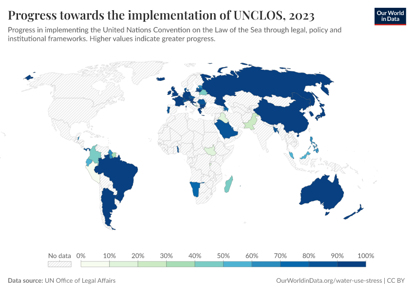 “Data Page: Progress towards the implementation of UNCLOS”. Our World in Data (2026). Data adapted from UN Office of Legal Affairs. Retrieved from https://chart-preview-staging.owid.pages.dev:8789/20251120-211749/grapher/implementation-of-unclos.html [online resource] (archived on November 20, 2025).How to cite this data