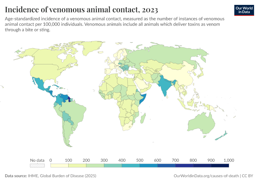 IHME, Global Burden of Disease (2025) – with major processing by Our World in Data. “Incidence of venomous animal contact” [dataset]. IHME, Global Burden of Disease, “Global Burden of Disease - Prevalence and Incidence” [original data]. Retrieved February 23, 2026 from https://chart-preview-staging.owid.pages.dev:8789/20260212-172132/grapher/incidence-of-venomous-animal-contact.html (archived on February 12, 2026).