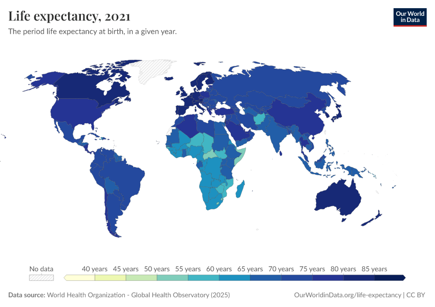 “Data Page: Life expectancy”. Our World in Data (2026). Data adapted from World Health Organization. Retrieved from https://chart-preview-staging.owid.pages.dev:8789/20260119-070102/grapher/life-expectancy-at-birth-who-gho.html [online resource] (archived on January 19, 2026).How to cite this data