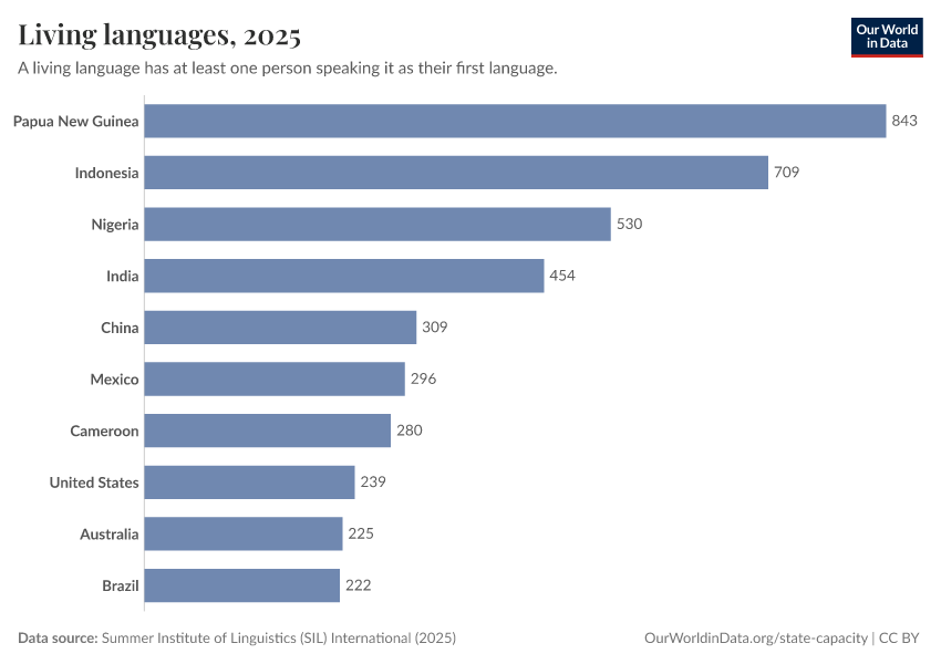 “Data Page: Living languages”, part of the following publication: Bastian Herre and Pablo Arriagada (2023) - “State Capacity”. Data adapted from Summer Institute of Linguistics (SIL) International. Retrieved from https://chart-preview-staging.owid.pages.dev:8789/20251023-195030/grapher/living-languages.html [online resource] (archived on October 23, 2025).