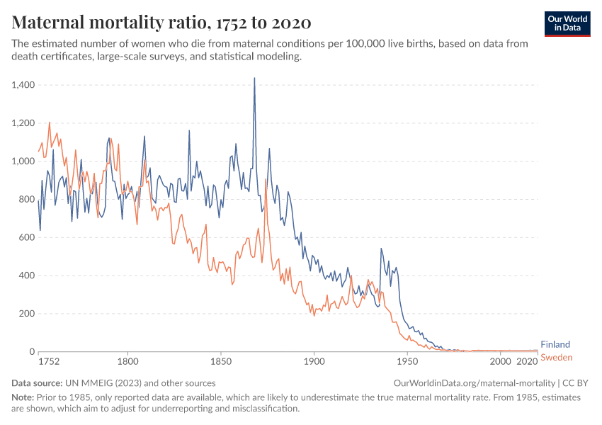 UN MMEIG (2023); WHO Mortality Database (2025); UN, World Population Prospects (2024); Gapminder (2010) – with major processing by Our World in Data. “Maternal mortality ratio” [dataset]. UN MMEIG (WHO, UNICEF, UNFPA, World Bank Group and UNDESA/ Population Division), “Trends in maternal mortality 2020”; WHO Mortality Database, “WHO Mortality Database”; United Nations, “World Population Prospects”; Gapminder, “Maternal mortality ratio V1” [original data]. Retrieved February 23, 2026 from https://chart-preview-staging.owid.pages.dev:8789/20260119-065148/grapher/maternal-mortality.html (archived on January 19, 2026).