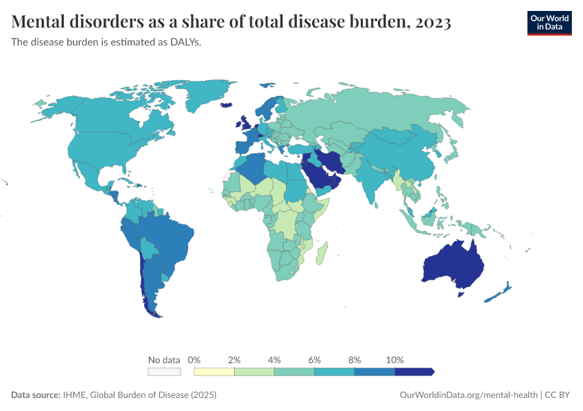 IHME, Global Burden of Disease (2025) – with major processing by Our World in Data. “Mental disorders as a share of total disease burden” [dataset]. IHME, Global Burden of Disease, “Global Burden of Disease - DALYs” [original data]. Retrieved February 23, 2026 from https://chart-preview-staging.owid.pages.dev:8789/20260211-174736/grapher/mental-and-substance-use-as-share-of-disease.html (archived on February 11, 2026).