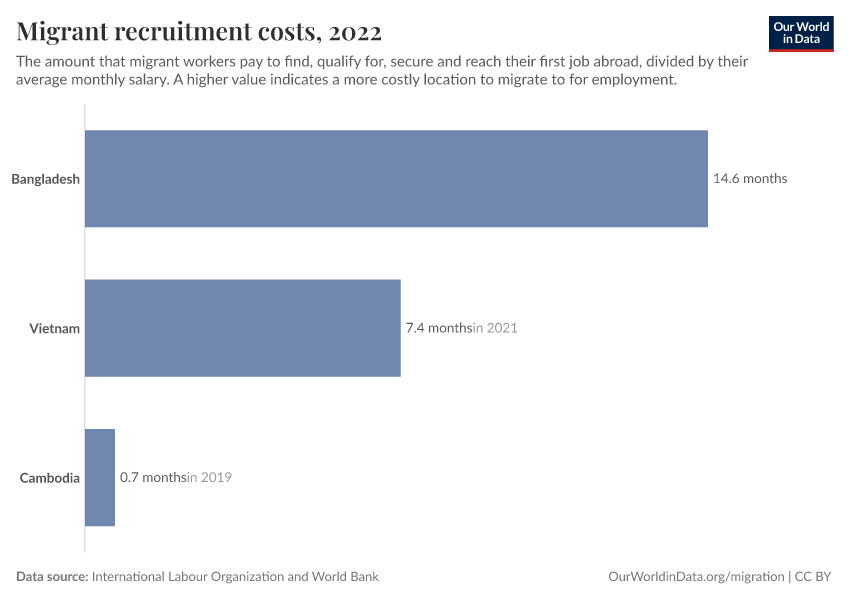 “Data Page: Migrant recruitment costs”. Our World in Data (2026). Data adapted from International Labour Organization and World Bank. Retrieved from https://chart-preview-staging.owid.pages.dev:8789/20251120-211749/grapher/migrant-recruitment-costs.html [online resource] (archived on November 20, 2025).How to cite this data