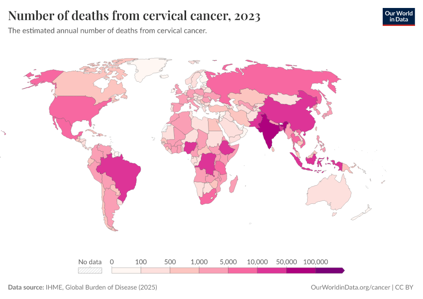 IHME, Global Burden of Disease (2025) – with major processing by Our World in Data. “Number of deaths from cervical cancer” [dataset]. IHME, Global Burden of Disease, “Global Burden of Disease - Deaths” [original data]. Retrieved February 23, 2026 from https://chart-preview-staging.owid.pages.dev:8789/20260211-174736/grapher/number-of-deaths-from-cervical-cancer.html (archived on February 11, 2026).