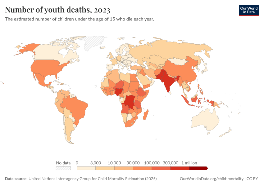 United Nations Inter-agency Group for Child Mortality Estimation (2025) – with minor processing by Our World in Data. “Under-fifteen deaths” [dataset]. United Nations Inter-agency Group for Child Mortality Estimation, “United Nations Inter-agency Group for Child Mortality Estimation”; UN Inter-agency Group for Child Mortality Estimation, “Child Mortality Estimates 2018”; Various sources, “Population” [original data]. Retrieved February 23, 2026 from https://chart-preview-staging.owid.pages.dev:8789/20260119-070102/grapher/number-of-youth-deaths.html (archived on January 19, 2026).