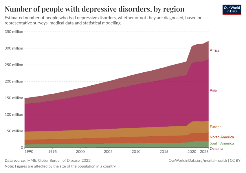 IHME, Global Burden of Disease (2025) – with major processing by Our World in Data. “Number of people with depressive disorders, by region” [dataset]. IHME, Global Burden of Disease, “Global Burden of Disease - Mental Health Prevalence” [original data]. Retrieved February 23, 2026 from https://chart-preview-staging.owid.pages.dev:8789/20260212-100858/grapher/number-suffering-from-depression-by-region.html (archived on February 12, 2026).