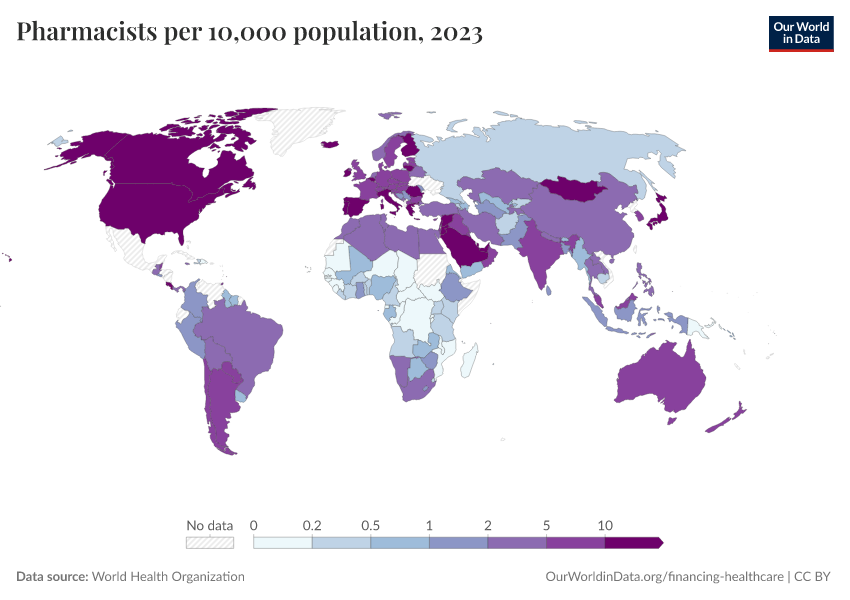 “Data Page: Pharmacists per 10,000 population”. Our World in Data (2026). Data adapted from World Health Organization. Retrieved from https://chart-preview-staging.owid.pages.dev:8789/20260130-180113/grapher/pharmaceutical-personnel-per-1000.html [online resource] (archived on January 30, 2026).How to cite this data