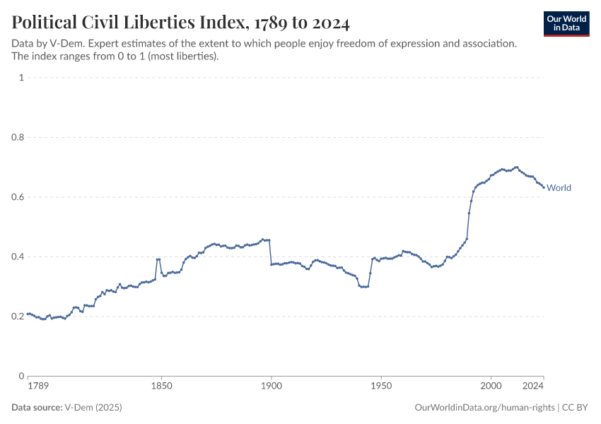 “Data Page: Political civil liberties index”, part of the following publication: Bastian Herre, Lucas Rodés-Guirao, and Esteban Ortiz-Ospina (2013) - “Democracy”. Data adapted from V-Dem. Retrieved from https://chart-preview-staging.owid.pages.dev:8789/20260119-070102/grapher/political-civil-liberties-index.html [online resource] (archived on January 19, 2026).