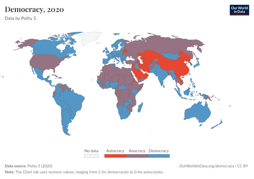 Polity 5 (2020) – processed by Our World in Data. “Democracy” [dataset]. Polity 5, “Polity5 Project, Political Regime Characteristics and Transitions, 1800-2018 5” [original data]. Retrieved February 23, 2026 from https://chart-preview-staging.owid.pages.dev:8789/20250909-093708/grapher/political-regime-polity.html (archived on September 9, 2025).